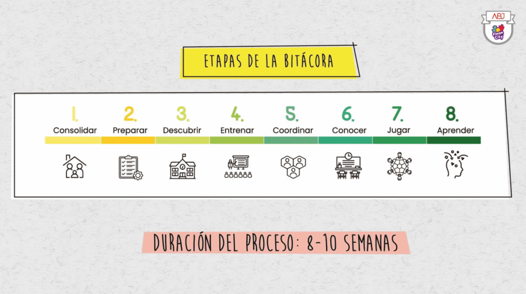 El curso de formación Facilitadores ABJ FinanCity estuvo compuesto de 2 etapas formativas. En una primera instancia se impartieron dos jornadas presenciales de capacitación a docentes -de la zona andina y costera de la Región de Antofagasta- junto a algunos integrantes de los Gabinetes Técnicos de los sostenedores de Antofagasta y Calama. Seguido de esta experiencia de aprendizaje presencial y para optar a certificarse como Facilitadores ABJ FinanCity, la segunda etapa del proceso requiere aprobar el curso online que considera la implementación efectiva en aula como requisito para obtener su diploma, por cuanto el objetivo es que la innovación educativa llegue e impacte en los aprendizajes de sus estudiantes, tal como ocurrió con quienes participaron.