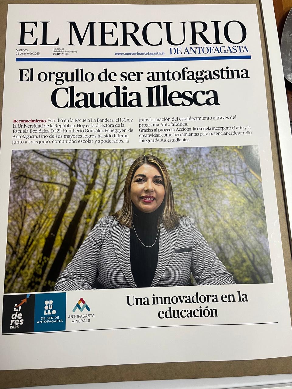 Claudia Illesca Andrade, Directora de la Escuela Ecológica Humberto González Echegoyen D-121 de Antofagasta, fue una de las premiadas por su quehacer y compromiso con la educación pública. Uno de sus mayores logros ha sido liderar, junto a su equipo, la transformación de su establecimiento junto al programa AntofaEDUCA.