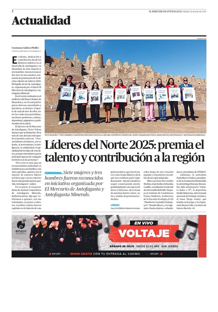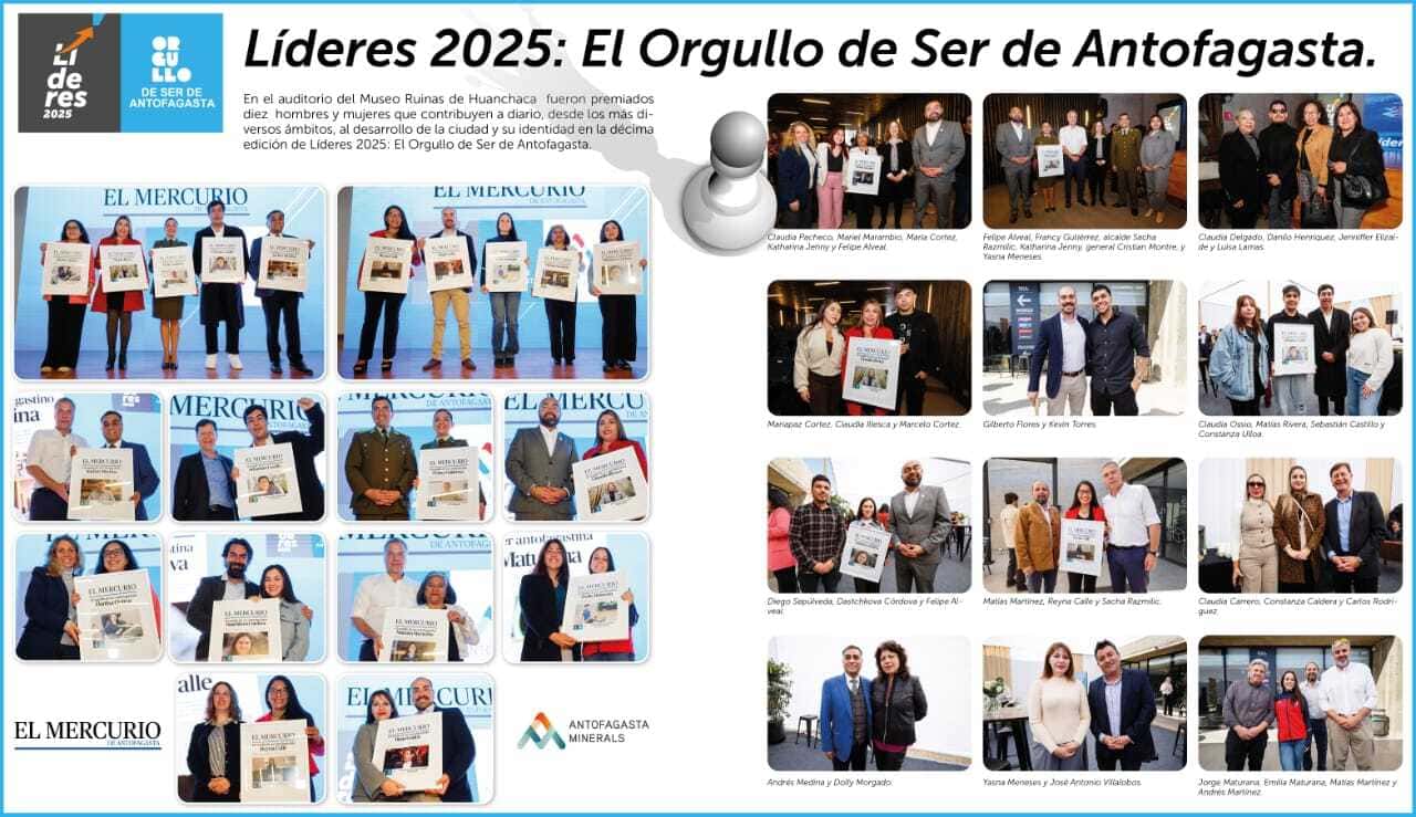 El Mercurio de Antofagasta, junto a Antofagasta Minerals (AMSA), celebró una emotiva jornada con la premiación “Líderes 2025: El Orgullo de Ser de Antofagasta” en su décima edición realizada el 25 de julio de 2025 en el Auditorio del Museo Ruinas de Huanchaca, una iniciativa que destaca el compromiso, talento y contribución de mujeres y hombres que marcan la diferencia en distintos ámbitos del quehacer local.